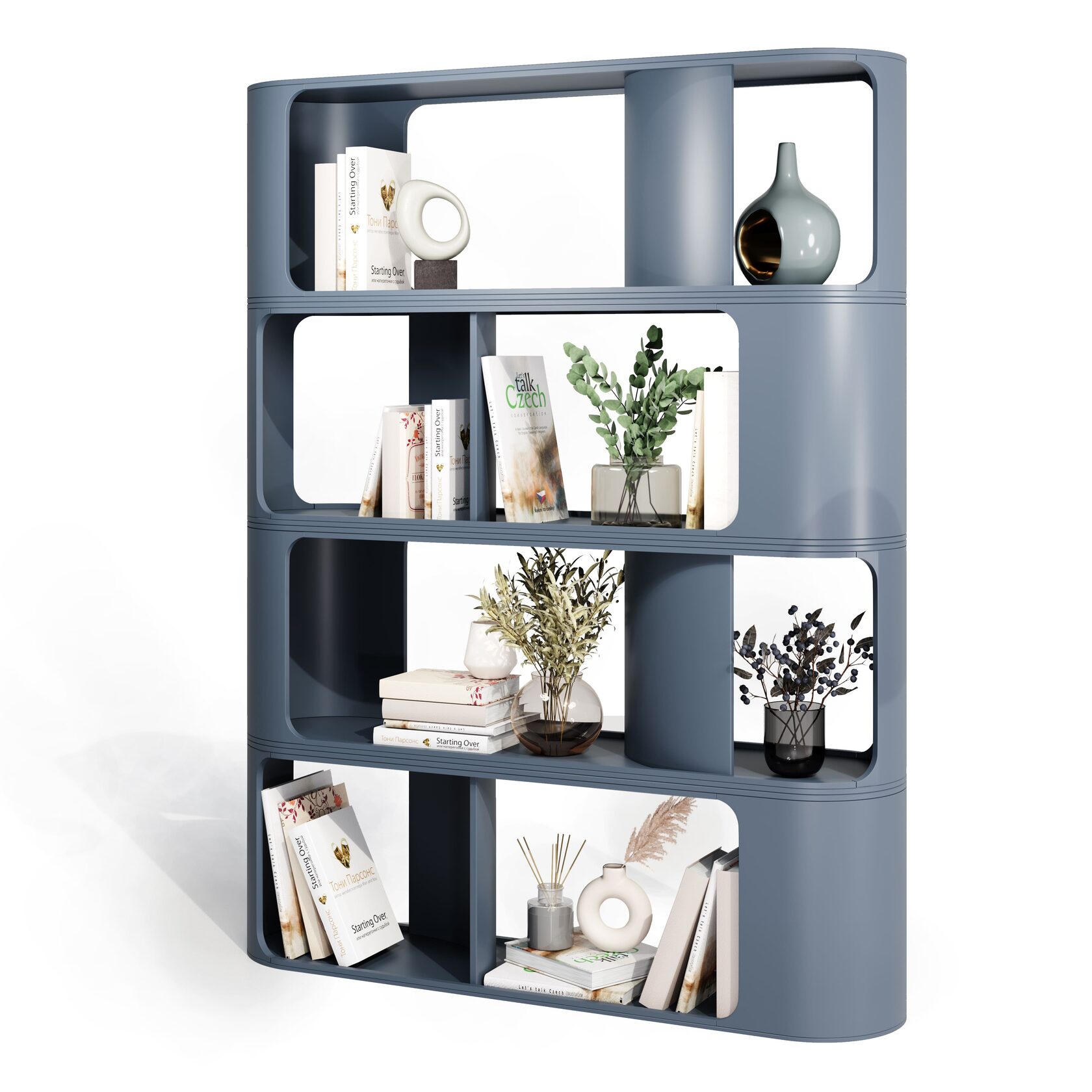 Благодаря необычной форме и архитектуре внутренних вертикалей, задающих центрическое движение в разные стороны, этот стеллаж привлечёт всеобщее внимание.